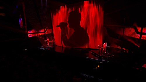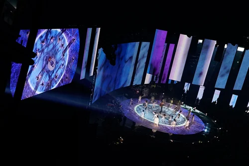 During this time, Dan Bond was brought in as assistant programmer, and Luke Halls as video lead, managing the content creation pipeline and liaising with the camera directors. To achieve flawless live video, we combined a few things; using Notch blocks designed to manipulate camera images live, deploying a traditional PPU system to manage the large camera shoot for the show, and a small number of ISO's, which fed into d3 and sequenced on the timeline. This allowed us to perfectly time choreographed shots to the beat, bringing in an aesthetic usually reserved for music videos, enhancing the slick performance on stage.
